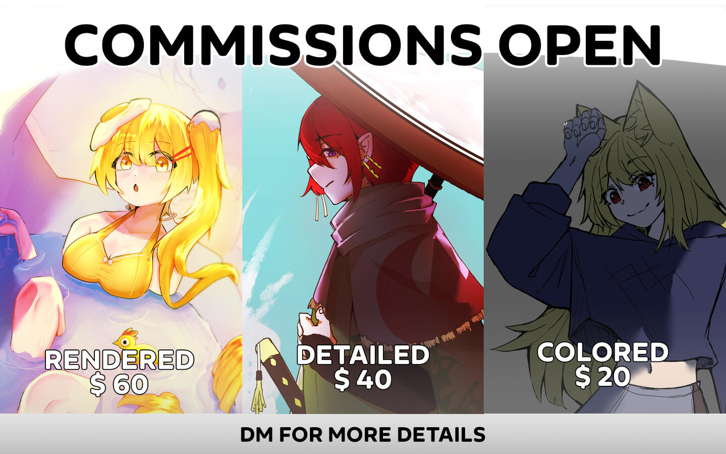 I. GENERAL TERMS.Please write in a clear and nice manner.Provide neat references.Not a wall of text. But giving both is fine.Any ill behavior will not be tolerated and your commission will be canceled if it occurs.If you fail to follow the rules provided I have the right to decline your commission.II. PAYMENTAll commissions must be paid in half, the first half of the agreed total price once the sketch is approved by the customer, and the latter half after the commission is done.The customer will not receive the final product unless paid in full.